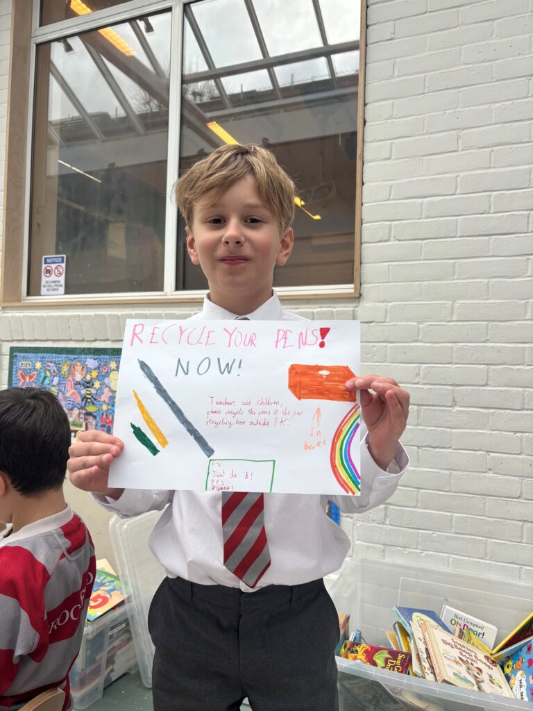 And the members of Eco club would like Broomfield to do their bit – there is now a box in reception and we are asking the students and teachers of Broomfield to bring in any old pens and post them in the box. All pens welcome from biros to felt tips to high-lighters. Once the box is full we can send it off for the pens to be recycled. Our Eco ambassadors spent some time making amazing eye catching posters to inform their fellow classmates.