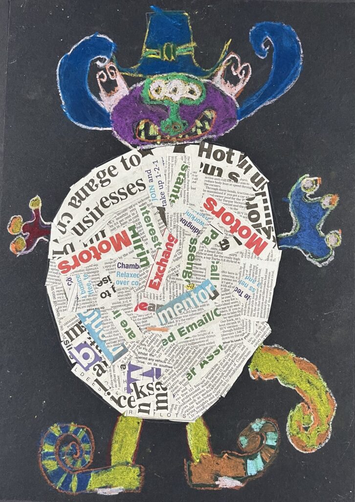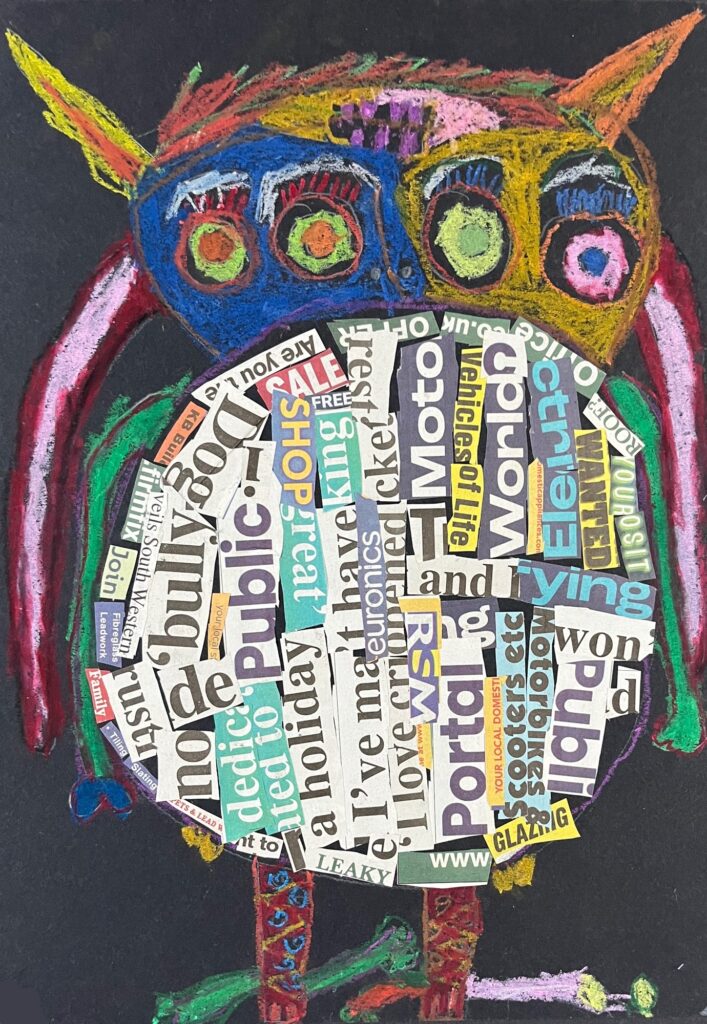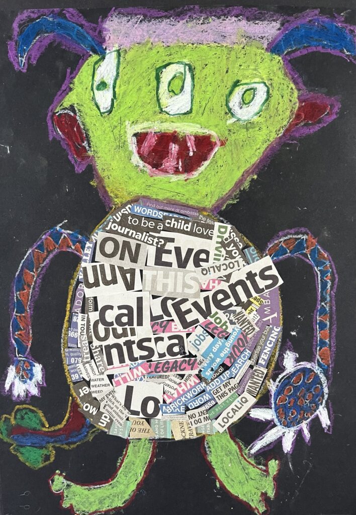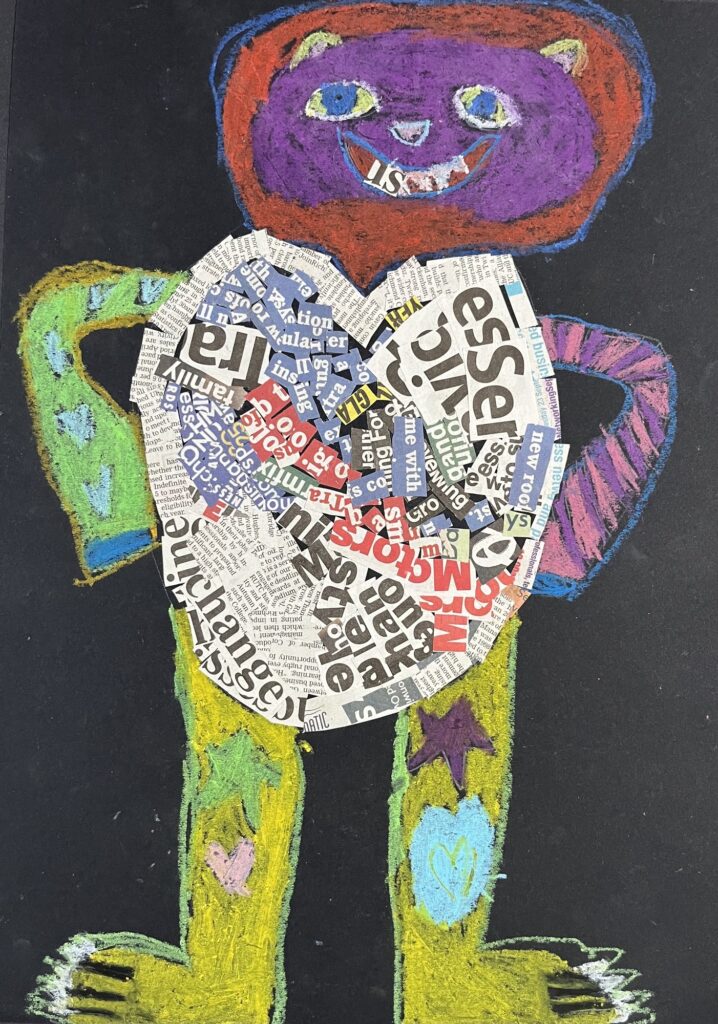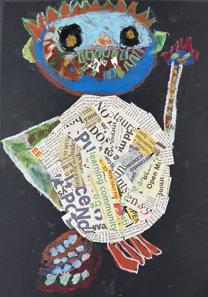 Year 2 invented letter-eating monsters. The children designed imaginative creatures on a black background. They had the opportunity to practise their oil pastel skills, followed by some collage work to improve their cutting and sticking techniques.