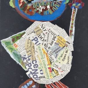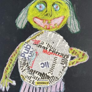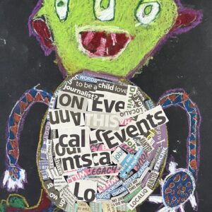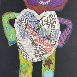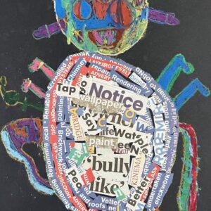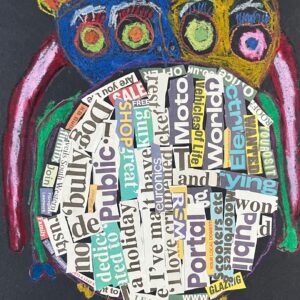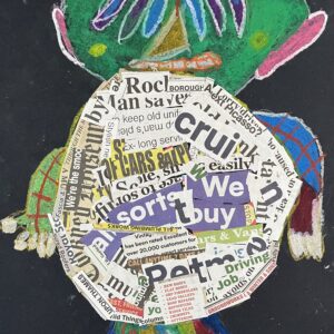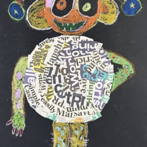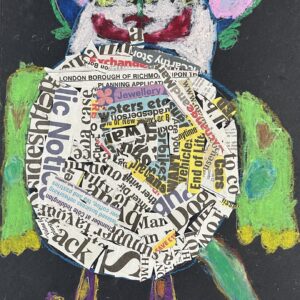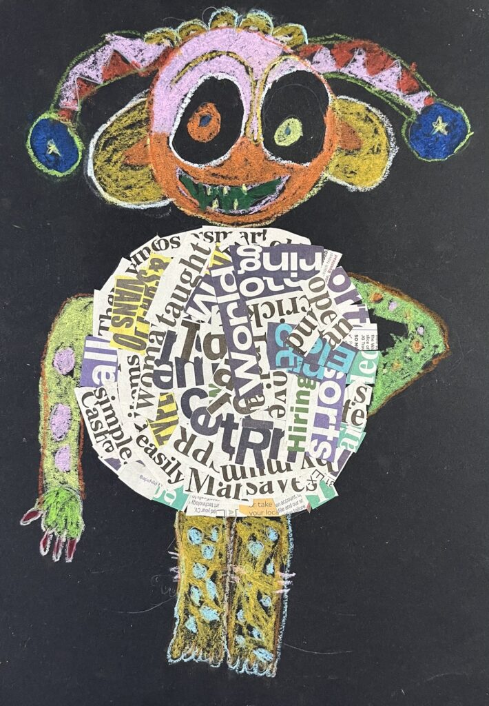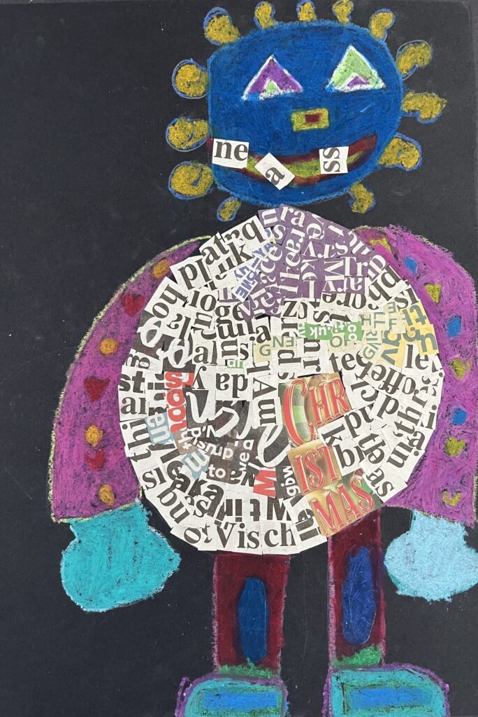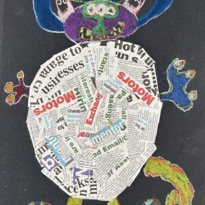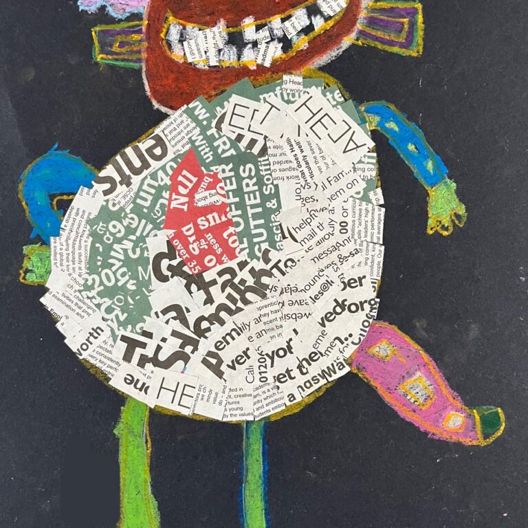 Year 2 invented letter-eating monsters. The children designed imaginative creatures on a black background. They had the opportunity to practise their oil pastel skills, followed by some collage work to improve their cutting and sticking techniques.