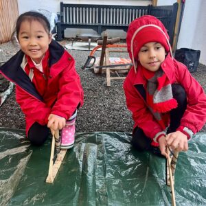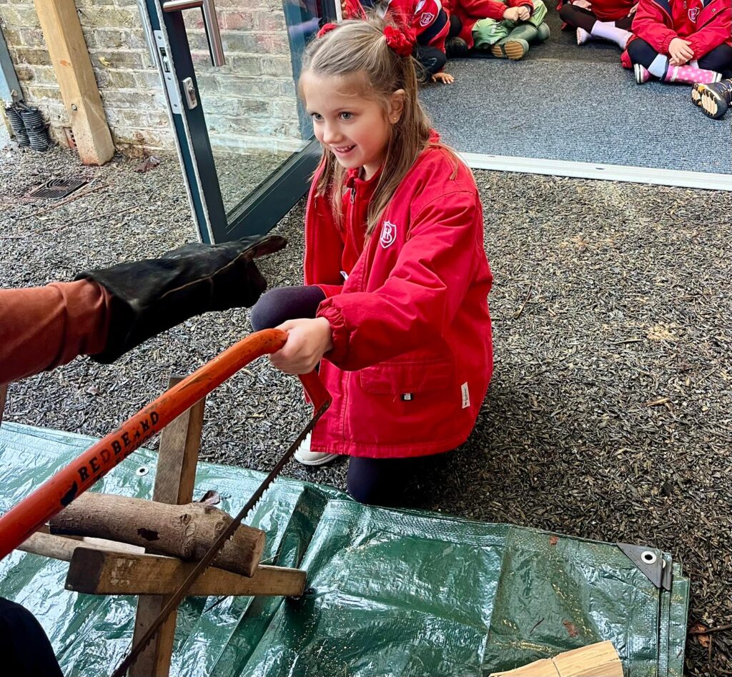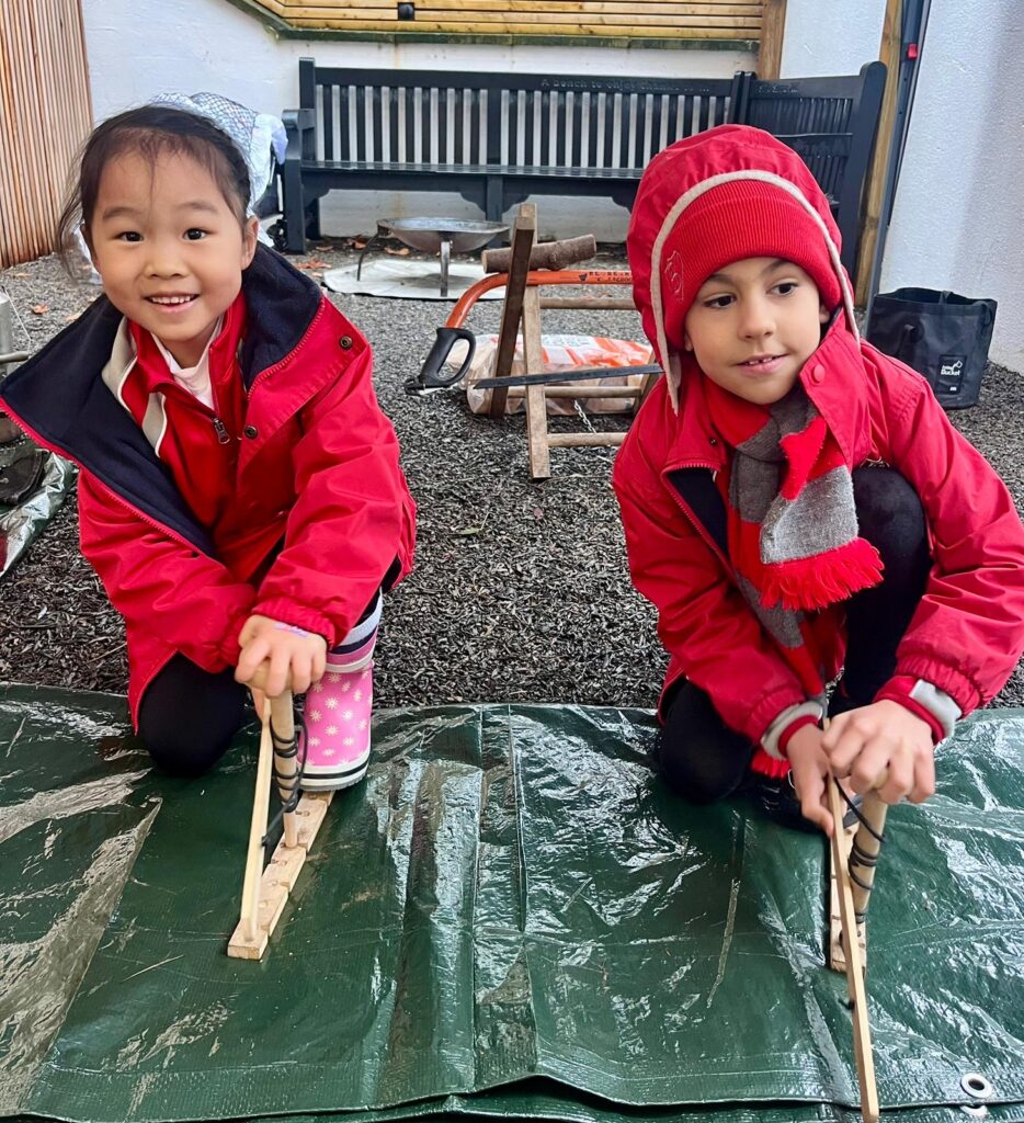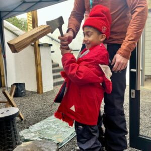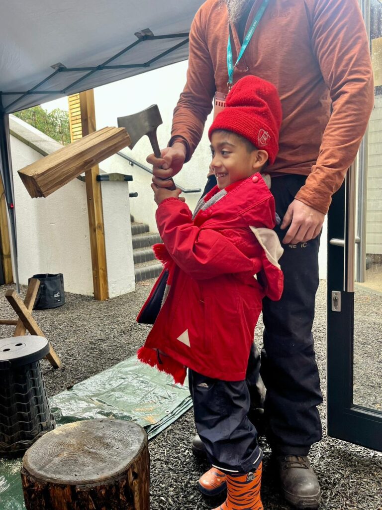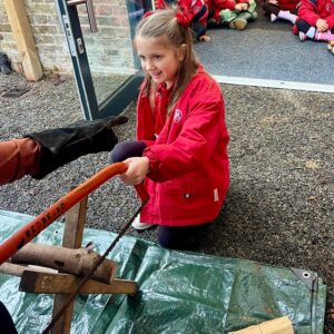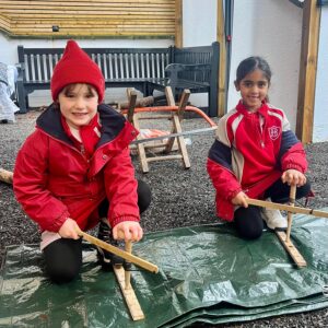 Year 1 had a wonderful time at Forest School this morning and the wet weather did not dampen their spirits! They all had a turn using a bow drill and learnt how the friction between two pieces of wood can make smoke! We read the book ‘Kitchen Disco’ and had a little dance! Scott showed us all how to cut wood with a bill hook and a bow saw and a few of the Year 1 children had a turn using them. The class were very impressed when Diego used a hand axe for the first time! Scott then made some kindling using a ‘feather stick’ and started a fire. We used the fire to boil some water and all drank hot squash to warm us up. We finished with a sing-a-long to one of the children’s favourite songs, ‘Down by the Bay’. It was a fabulous-forest-esque end to the week!